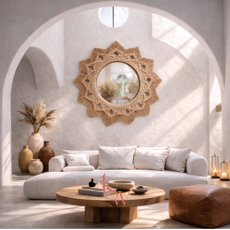 Add warmth and bohemian elegance to your home with this handmade macrame sun mirror. Inspired by Mediterranean and Moroccan craftsmanship, this decorative wall mirror brings texture, softness, and authenticity to any interior.